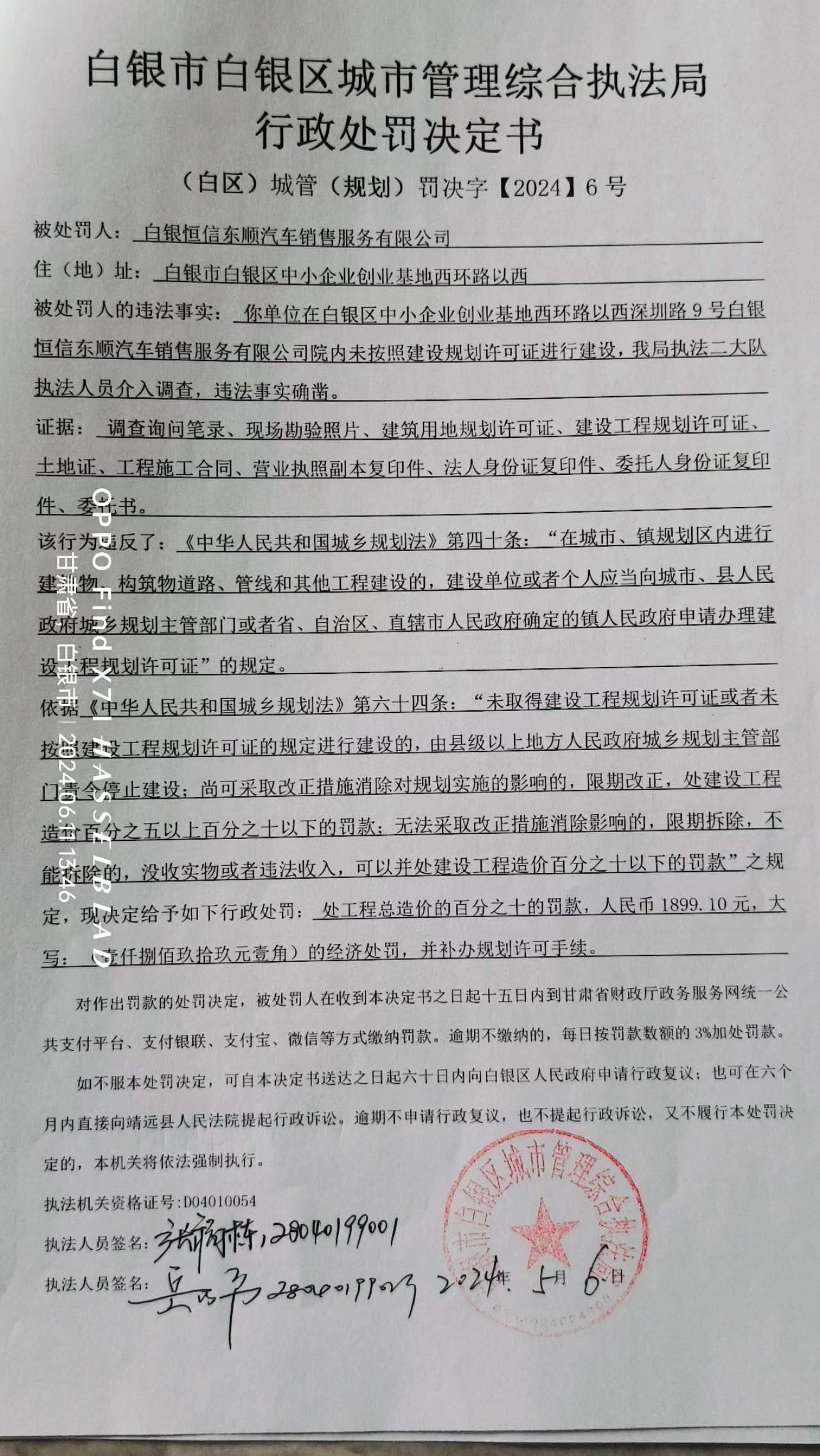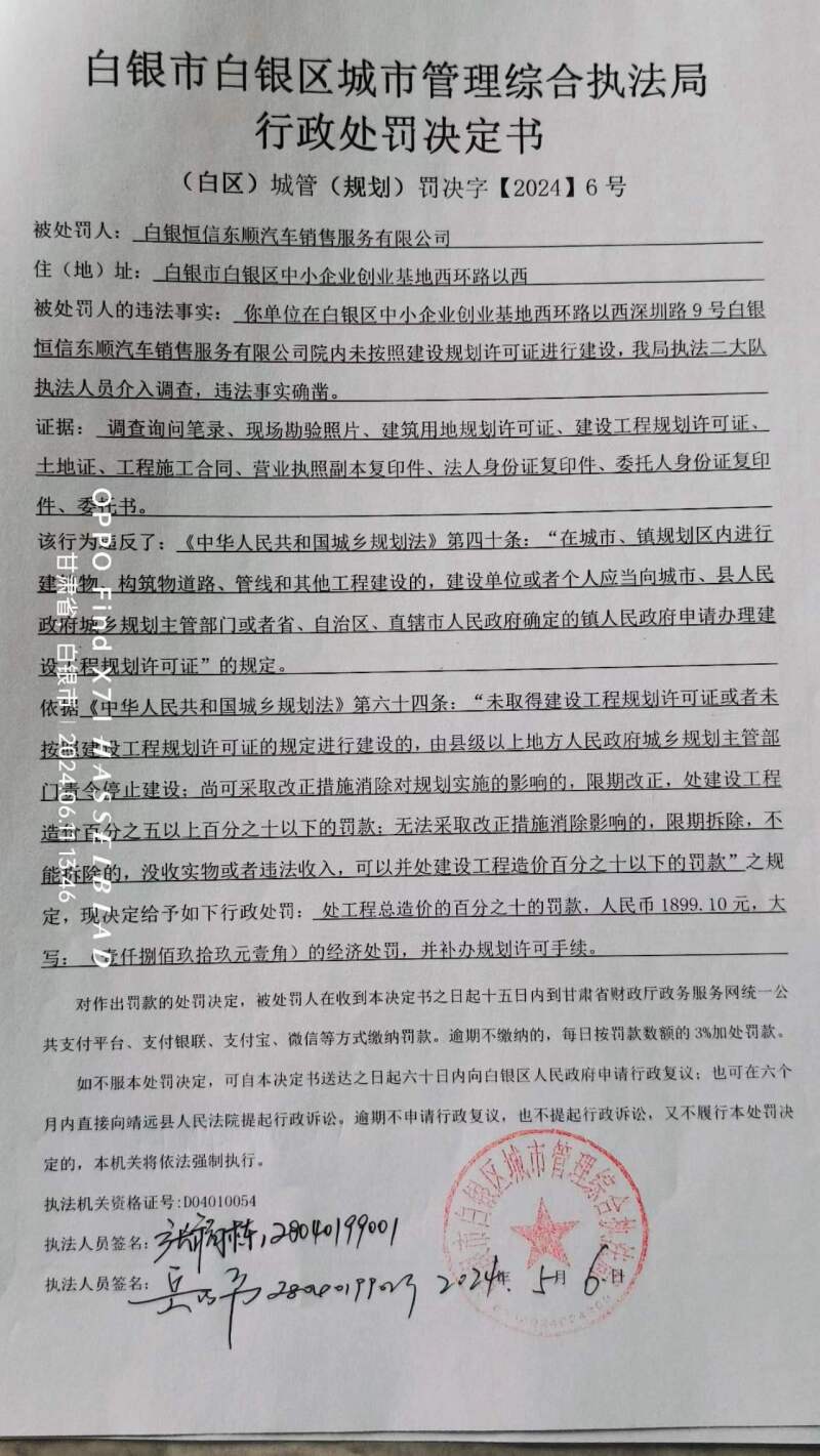 白银市白银区城市管理综合执法局行政处罚决定书[2024]6号