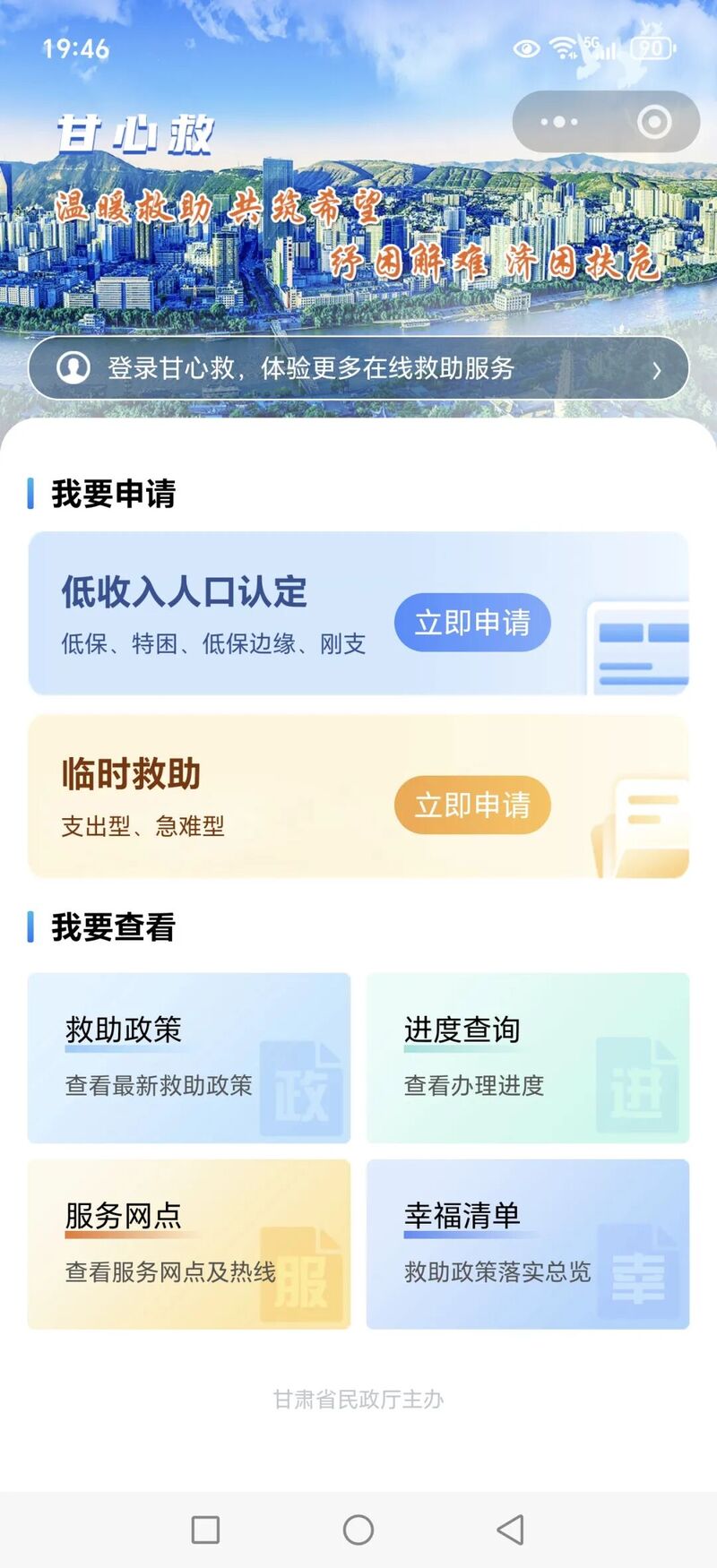 “甘心救”小程序集政策咨询、救助申请、进度查询、服务网点及热线查询等功能于一体。群众通过微信搜索“甘心救”或扫描指定二维码即可进入使用,在线提交最低生活保障、特困人员救助供养、临时救助等申请,并实时跟踪办理进度。