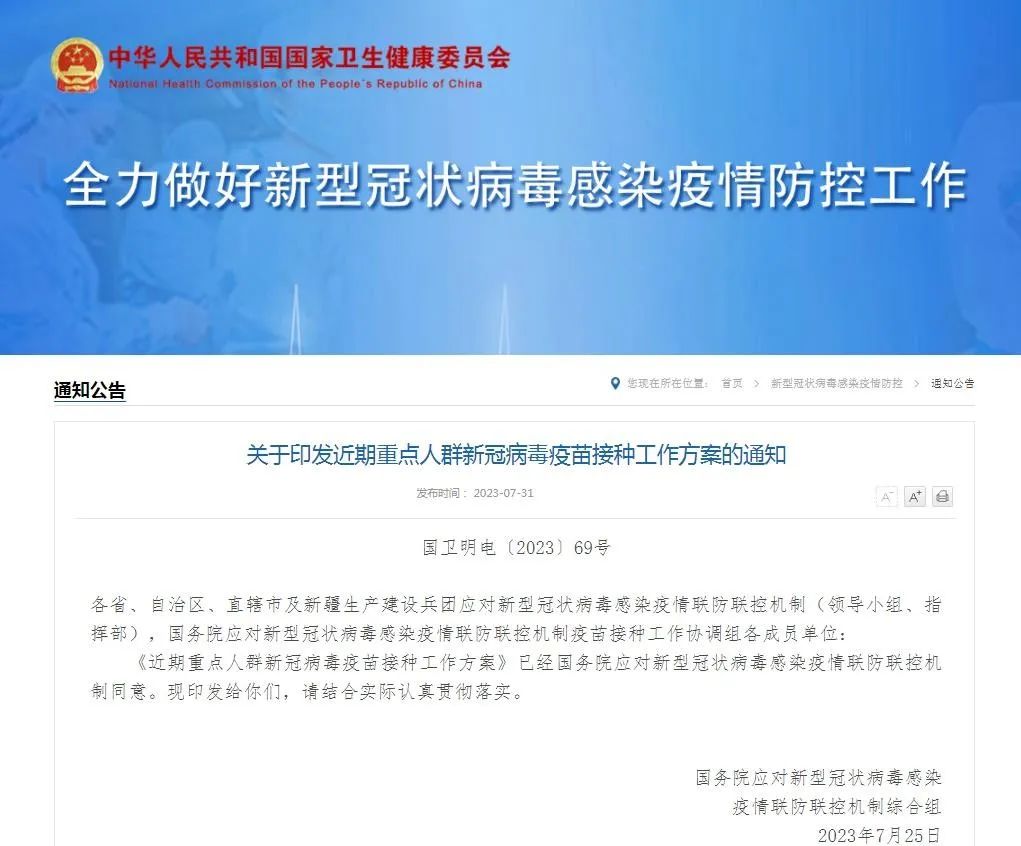 新冠疫苗接种最新通知: 重点人群优先推荐接种 含XBB变异株抗原成分的疫苗 近日,国务院应对新型冠状病毒感染疫情联防联控机制综合组发布《关于印发近期重点人群新冠病毒疫苗接种工作方案的通知》。通知称,为应对今年秋冬季新冠疫情,对老年人等重点人群实施针对性新冠病毒疫苗接种。推荐接种疫苗为成都威斯克重组三价新冠病毒(XBB+BA.5+Delta变异株)三聚体蛋白疫苗。 关于印发近期重点人群 新冠病毒疫苗接种工作方案的通知 国卫明电电〔2023〕69号 各省、自治区、直辖市及新疆生产建设兵团应对新型冠状病毒感染疫情联防联控机制(领导小组、指挥部),国务院应对新型冠状病毒感染疫情联防联控机制疫苗接种工作协调组各成员单位: 《近期重点人群新冠病毒疫苗接种工作方案》已经国务院应对新型冠状病毒感染疫情联防联控机制同意。现印发给你们,请结合实际认真贯彻落实。 国务院应对新型冠状病毒感染 疫情联防联控机制综合组 2023年7月25日 近期重点人群 新冠病毒疫苗接种工作方案 一、目标人群 疫苗接种是防控新冠病毒感染疫情的重要手段。国务院联防联控机制根据根据疫苗研发和审评审批进展,结合疫情形势、病毒变异等情况,科学合理制定并不断完善新冠病毒疫苗接种策略,先后部署了新冠病毒疫苗基础免疫、第一剂次和第二剂次加强免疫接种、补齐免疫水平差距等工作。各地加大了接种组织实施力度,新冠病毒疫苗接种工作取得积极进展,截至目前,全国累计报告接种新冠病毒疫苗34.97亿剂次,接种总人数达13.10亿人,全程接种12.77亿人。 |