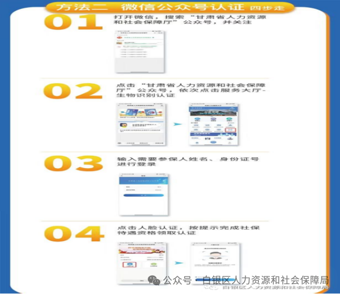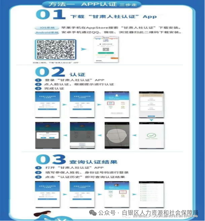 尊敬的城乡居民养老待遇领取人员、城镇职工(离)退休基本养老待遇领取人员: 你们好!根据甘肃省社会保险事业中心《关于进一步优化领取社会保险待遇资格认证方式的通知》(甘社保发〔2021〕103号)文件要求,为防止冒领养老金问题发生,确保养老保险基金不受损失,已领取养老金人员在一年(12个月)之内至少完成一次自助资格认证,逾期未认证的,将暂停养老金发放,待补办认证后从次月恢复待遇发放并补发停发期间的养老金。请您合理安排认证时间,及时完成认证。也请广大春节返乡的朋友,为您的家人完成2026年养老资格认证!大家可通过“甘肃人社认证”手机APP和“甘肃省人力资源和社会保障厅”微信公众号进行自助资格认证。 社会保险待遇领取资格自助认证方法步骤:一是搜索“甘肃人社认证”或扫描下方二维码下载“甘肃人社认证”APP,安装成功后,输入姓名、身份证号码登录,按照提示完成操作。 二是在微信搜索“甘肃省人力资源和社会保障厅”公众号,进行关注,进入公众号,点击服务大厅后,点击生物识别认证,输入姓名、身份证号码登录,按照提示完成操作。 三是下载登录“掌上12333”APP,进行人脸识别自助认证。 四是协助认证。如果您不会使用或无智能手机,可通过子女或亲朋好友的手机帮助认证,也可到白银市政务服务大厅二楼东厅C4-C7窗口或就近的镇(街道)及社区便民服务中心进行认证。如有身体和其他特殊原因无法完成认证的待遇领取人员,请您主动联系居住的村(社区),由工作人员上门服务,协助完成认证。 联系电话:0943-8257538(城镇职工养老保险股) 0943-8250801(城乡居民养老保险股) 白银区社会保险事业服务中心 2026年1月22日 |