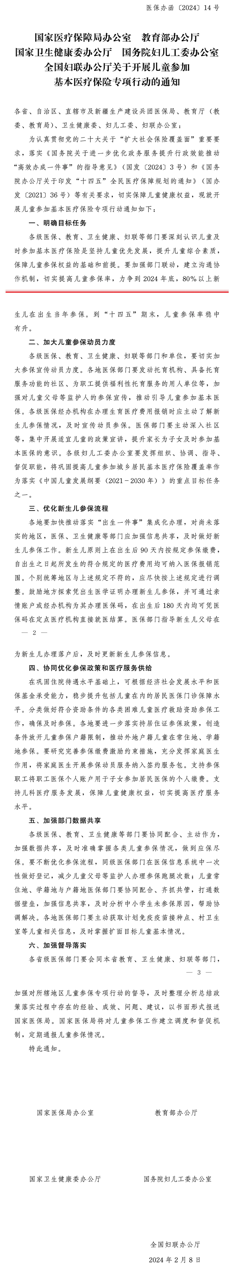 国家医疗保障局办公室 教育部办公厅 国家卫生健康委办公厅 国务院妇儿工委办公室 全国妇联办公厅关于开展儿童参加基本医疗保险专项行动的通知
