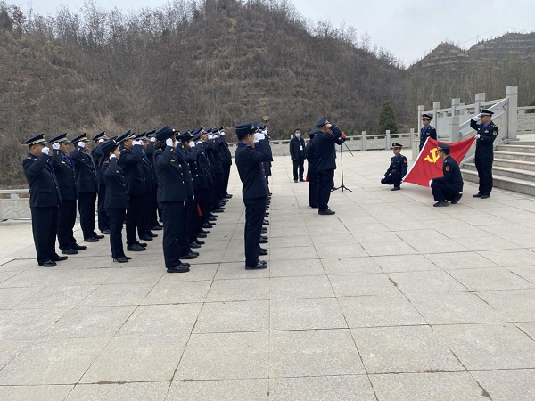“我志愿加入中国共产党,拥护党的纲领,遵守党的章程……”。鲜红的党旗前,全体党员干部在局党组成员、副局长李建贵同志的领誓下重温了入党誓词。铿锵有力的誓言彰显了城管执法队伍对党的忠诚,对初心的坚守和对责任的担当。