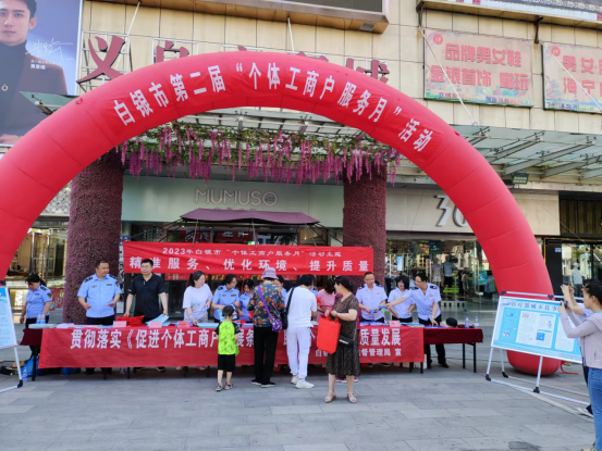 为深入贯彻党的二十大精神和中央、省、市促进个体工商户发展的决策部署,全面落实《促进个体工商户发展条例》,以更大力度促进个体工商户高质量发展,2023年7月10日,白银市区两级市场监督管理局在白银义乌商贸城广场举办白银市“第二届个体工商户服务月”宣传活动。活动现场通过接受群众咨询、发放宣传材料、开展走访调查等多种措施向广大个体工商户宣传登记注册、权益保护、创业就业等方面的新政策、新措施,提升个体经营者发展信心。