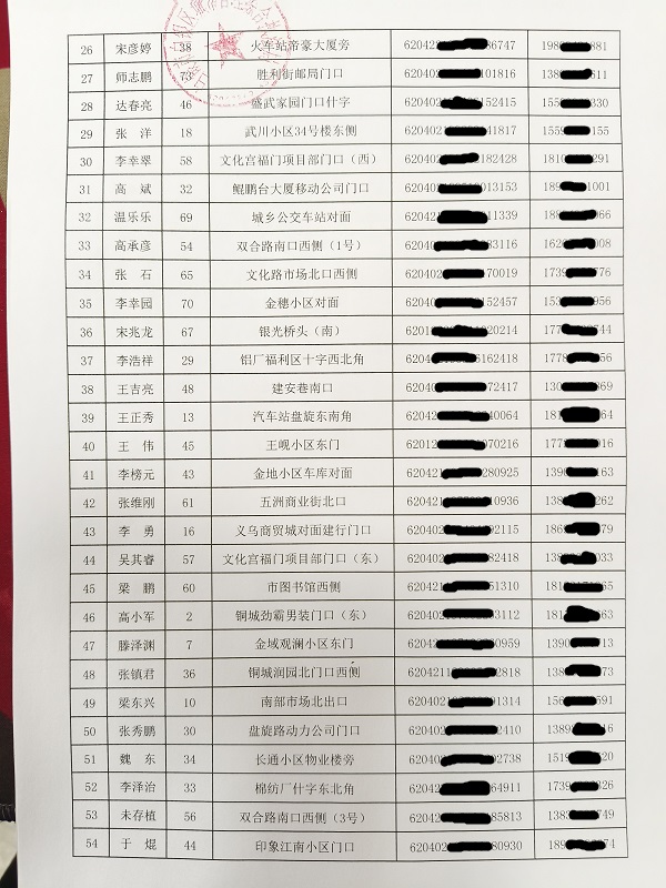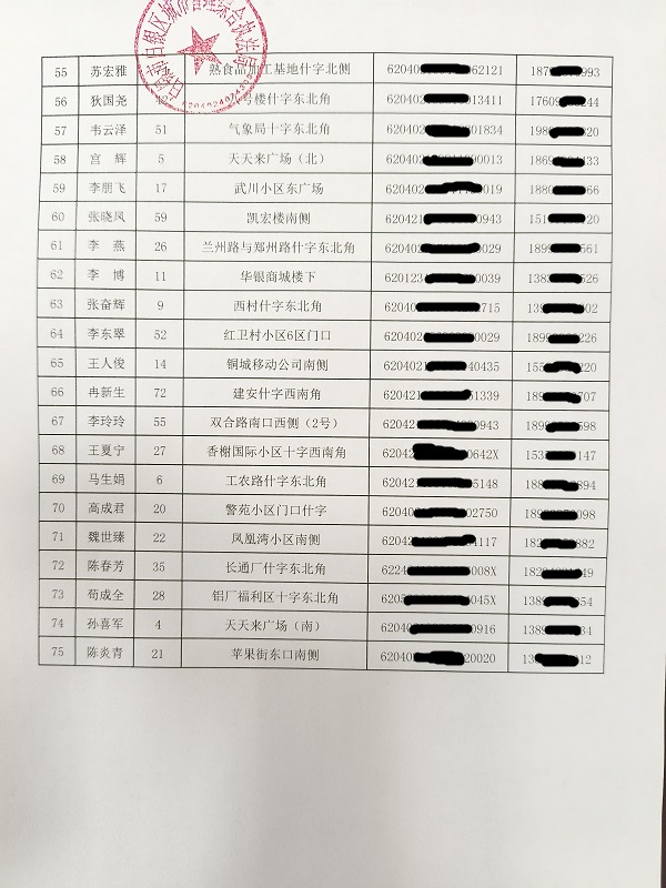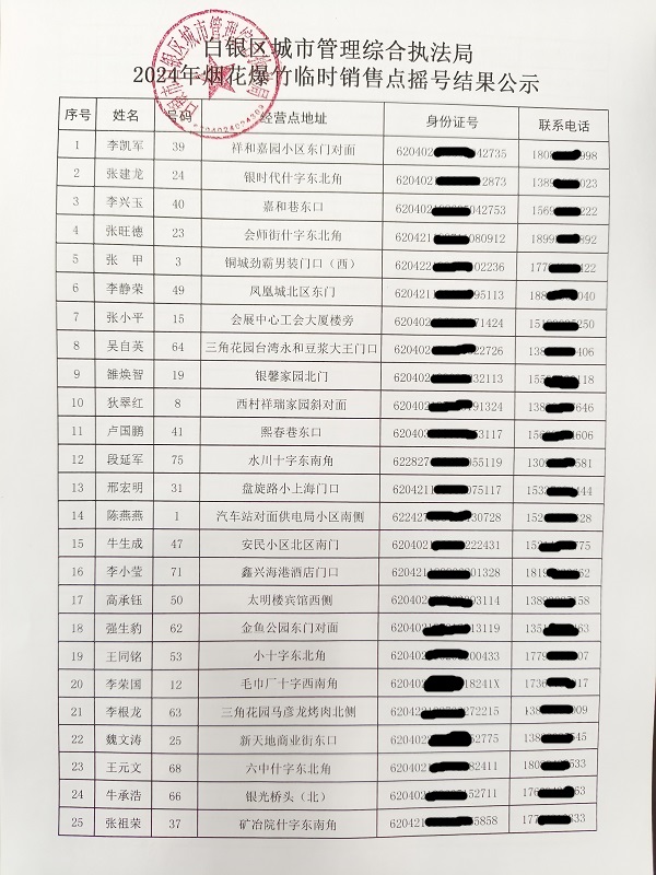 白银市白银区城市管理综合执法局关于《2024年白银城区烟花爆竹临时销售点摇号结果》的公示 来源:白银区人民政府 | 作者:白银区城管执法 | 日期:2024-01-25 13:42 | 阅读: 白银市白银区城市管理综合执法局于2024年1月24日下午3:00(周三)在局四楼会议室对白银区2024年春节期间烟花爆竹经营点位进行公开摇号分配,现将摇号结果公示如下: 白银市白银区城市管理综合执法局 2024年1月25日