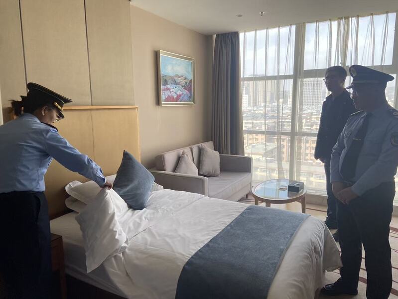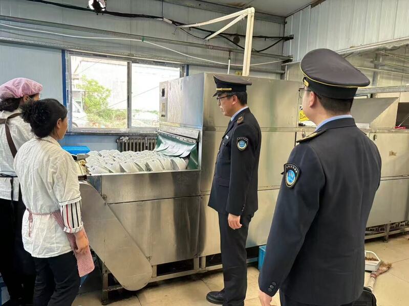 在餐饮具集中消毒单位,执法人员就卫生管理制度落实、生产环节卫生把控、出厂餐具自检、工作人员卫生管理及餐具清洗消毒执行等开展监督检查。