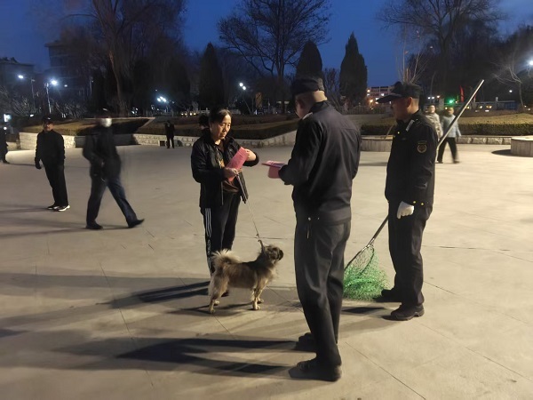 执法人员线上通过微信群、政务公众号推送文明养犬倡议;线下深入广场、小区、街巷,发放宣传资料,讲解养犬登记、疫苗接种、牵引规范等要点,呼吁养犬人履行免疫、办证、清便等义务。