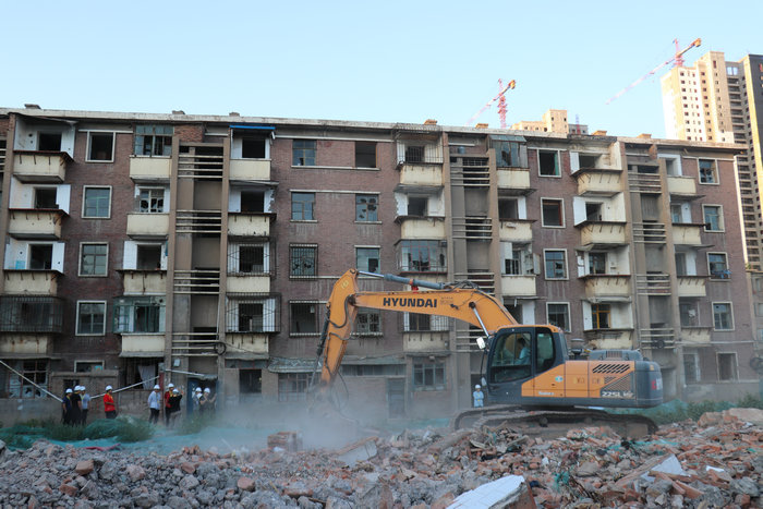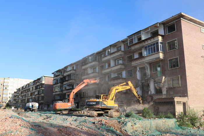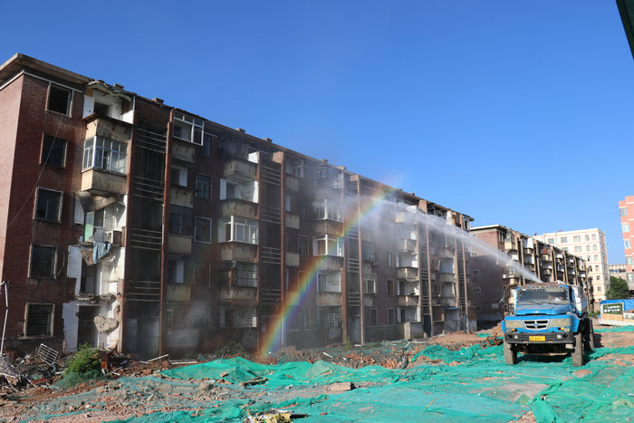 为稳妥做好拆除工作,提高拆除效率,白银区制定了严密的拆除实施方案,各工作小组按照指挥部统一部署,采取机械拆除和人工拆除相结合的方式,全面推进拆除工作。当日清晨,伴随着一声拆除令下,5台360长臂挖机挥舞着机械臂开始对旧楼房进行拆除,3台抑尘车启动高压水枪,为现场做好防尘、降尘。同时,各相关部门单位工作人员在现场向周围居民宣传政策、维持秩序、保障人员安全,拆除过程平稳、有序,拆除现场秩序井然。