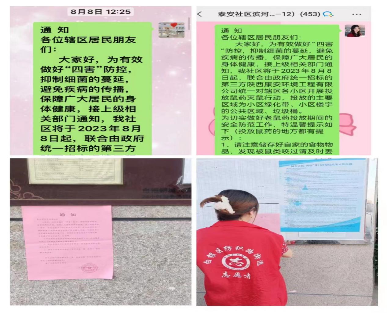 为预防传染病发生,降低老鼠带来的危害,有效控制鼠害繁殖和扩散,控制各类病媒传染性疾病的发生,保障辖区居民的健康和安全,巩固国家卫生城市创建成果,近日,泰安社区按照街道安排部署,联合由政府统一招标的第三方陕西康安环境工程有限公司在辖区范围内开展“投放鼠药,驱除害虫”活动。