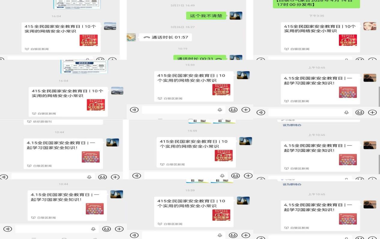 社区通过居民微信群转发国家安全相关知识、法律法规及警示案例,同时组织工作人员在辖区内通过入户发放宣传彩页,向居民讲解政治安全、网络安全、反诈防骗、个人信息保护等内容,引导居民主动学习安全知识,提高防范能力,自觉维护国家安全。