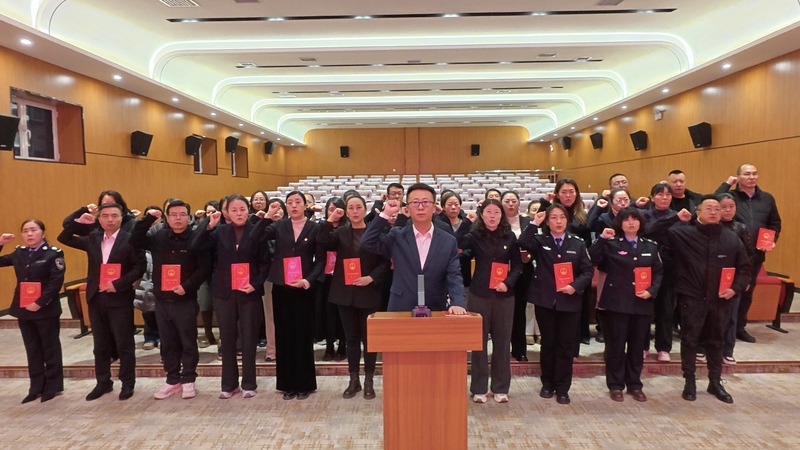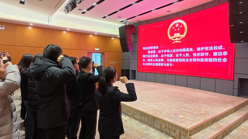 宣誓现场,奏唱中华人民共和国国歌。在领誓人的带领下,全体宣誓干部身着正装、精神饱满,左手抚按宪法,右手高高举拳,齐声跟诵誓词,“我宣誓:忠于中华人民共和国宪法,维护宪法权威,履行法定职责……”铿锵的誓词响彻全场,既是对宪法权威的尊崇敬畏,也是对人民群众的庄严承诺,更凝聚着基层干部担当作为的初心使命及践行法治精神的坚定决心。