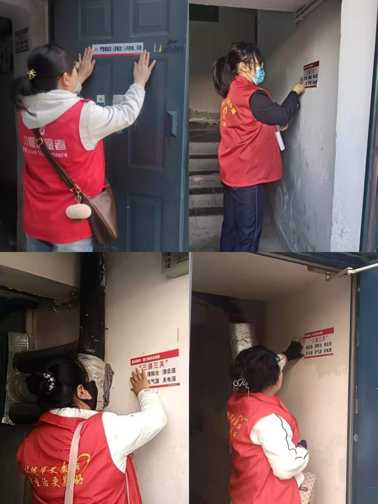 在宣讲演练之余,社区志愿者们身着红马甲,深入辖区各楼栋单元,在单元门、楼道等醒目位置张贴消防安全提示牌。提示牌清晰标注“三清三关”核心要求:清厨房、清阳台、清走道,关火源、关气源、关电源,同时明确“严禁电动车(及电池)入内充电、停放”等禁令,让居民出门就能看到、时刻牢记安全准则。