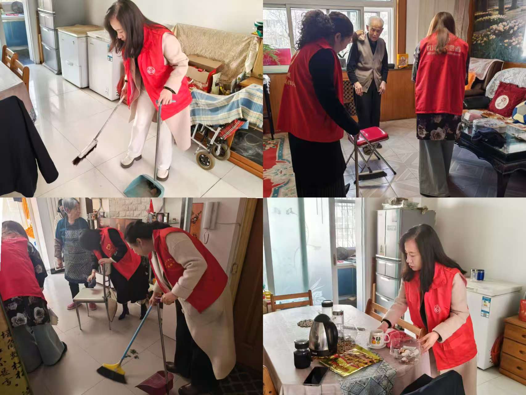 志愿服务的热情不仅温暖了人心,更让老人们的居家环境焕然一新。社区志愿者们带着笤帚、抹布、拖把等清洁工具,走进高龄、独居老人家中开展义务清洁。志愿者们分工协作,有的挥动笤帚清扫地面,有的擦拭门窗家具,有的整理杂物角落,仔细清理老人家中的卫生死角,不放过任何一处遗漏。看着原本略显杂乱的屋子变得窗明几净、整整齐齐,老人们连连道谢,脸上满是欣慰。志愿者们用双手为老人们打造了干净舒心的居住环境,也让关爱与温暖在烟火日常中传递。