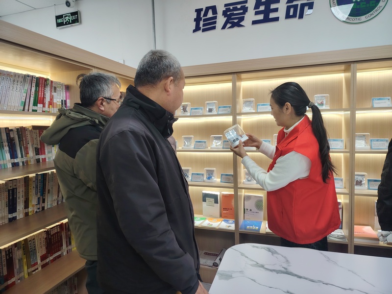 活动现场,身着红色志愿马甲的禁毒志愿者化身讲解员,首先引导居民参观仿真禁毒展品陈列区。通过展示毒品仿真样品,志愿者直观、形象地介绍了海洛因、冰毒、麻古等传统毒品的外观特征,并重点讲解了新型毒品的常见伪装形式与隐蔽危害,帮助外出务工人员和辖区居民更清晰、更深刻地认识毒品,提升辨别能力。