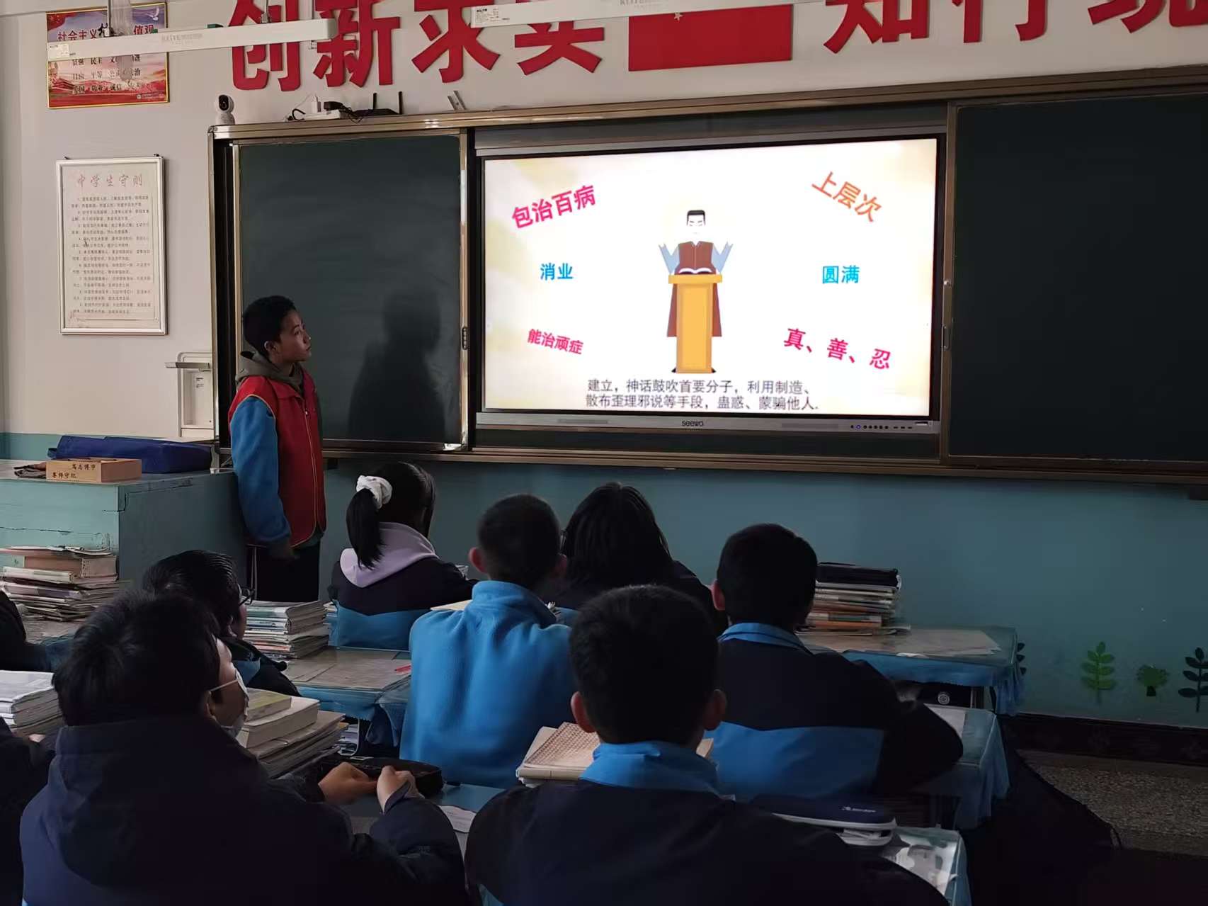活动中,同学们集中观看了反邪教公益宣传短片《阳光娃娃·反邪教小课堂》。该片采用生动有趣的动画形式,紧紧抓住了学生们的注意力,清晰揭示了邪教组织常用的“精神控制”“编造邪说”“聚敛钱财”等显著特征;深刻剖析了邪教摧残个人身心、破坏家庭幸福、危害社会稳定的巨大危害。结合中学生认知特点,传授了“不听邪教宣传、不信邪教谎言、不传邪教信息、发现可疑情况及时报告”等实用防范方法,引导同学们像“春苗”一样,在阳光雨露下茁壮成长,自觉抵制一切“精神毒瘤”的侵蚀。