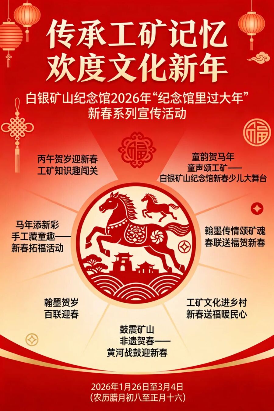 这个春节,白银文旅邀您一起,走进纪念馆,过个“不一样”的文化年:沉浸式探馆,触摸工业历史的脉搏;亲子互动体验,让孩子在玩乐中传承文化;笔墨送福,把传统年味带回家;文艺展演,感受工矿精神与童真交融。在历史的厚重中,感受文化的温度,在红火的年味里,触摸奋斗的精神。