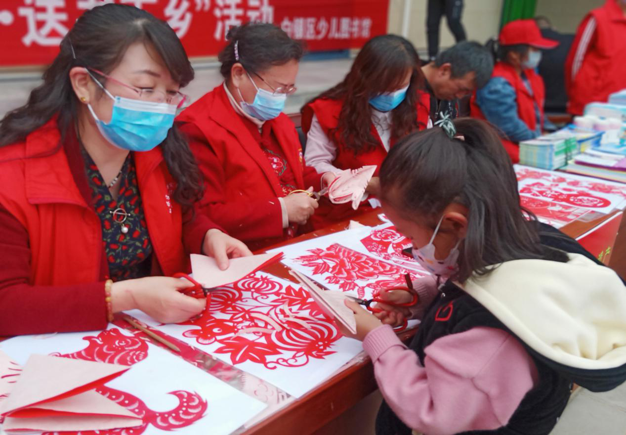 活动展览区,《中国梦》《甘肃方剂甜心间》《学习雷锋服务岗》等非遗剪纸艺术作品吸引了农民朋友和志愿者驻足欣赏,大家都为一个个感人的抗疫故事,一幕幕动人的爱心捐赠场景赞叹不已。非遗剪纸民间艺术家梁维珍、张巧燕现场向农民朋友和志愿者传授剪纸技术,并向她们赠送了各种各样精美的剪纸作品。“我喜欢学习剪纸,我想剪出很多可爱的小动物。”年仅6岁的小姑娘徐若婷认真地跟着剪纸老师学得有模有样,大家都为这个小小非遗传承人竖起了大拇指。在世界读书日来临之际,白银区少儿图书馆组织志愿者向群众推送“超星”“读博看期刊·博看有声”“读联体”等线上数字共享阅读服务平台,耐心讲解操作使用方法。志愿者还免费向群众发放《读者》《中国民俗故事》《国学经典》等书籍,为群众送上丰盛的文化套餐,让群众在腰包鼓起来的同时,真正实现精神脱贫。