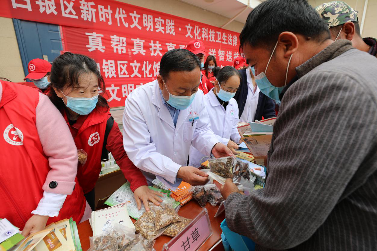 在疫情防控还未结束期间,为了提高群众健康素质,让群众在家门口享受到高质量的医疗卫生健康服务,白银区卫健局专门邀请甘肃省乡村名中医、水川中心卫生院院长俞海峰现场坐诊把脉,向农民朋友普及中药养生知识,赠送黄芪、藿香、甘草、贯众等中药包;参与义诊的医务人员仔细听取群众的咨询后,认真为他们解答疑问,测量血压血糖,讲解卫生保健、安全饮食、合理用药、常见的呼吸系统疾病及预防等卫生常识,并向群众发放《新型冠状病毒感染的肺炎防控知识手册》《居民保健知识》《中医体质养生保健篇》等宣传手册,让群众在辛勤劳作的同时,具备科学的健康理念。