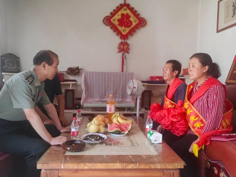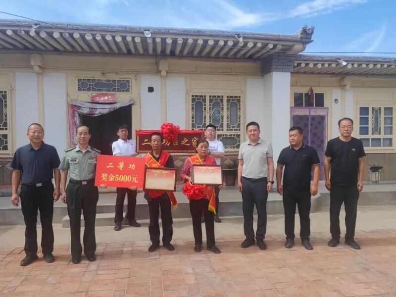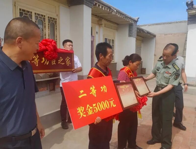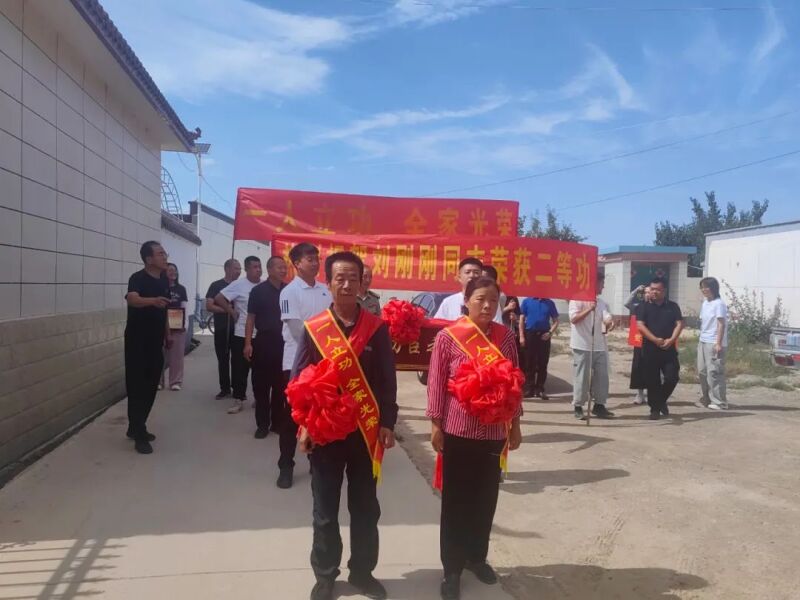 现场工作人员拉起贺喜的横幅,手抬二等功牌匾,伴随着欢快喜庆的锣鼓声,来到刘刚刚家中,宣读表彰通报并送上二等功喜报,向家属戴上光荣绶带和大红花,送上立功喜报,发放慰问金,对家属的支持致以崇高敬意,并详细询问了家属的家庭生活情况和刘刚刚在部队的服役情况,感谢他们为国家、为部队培养和输送了优秀人才。