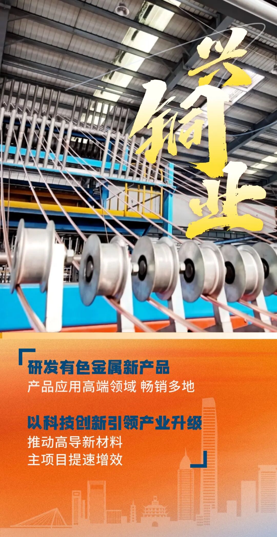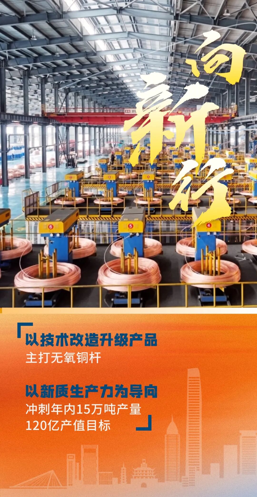 白银区融媒体中心记者王建鹏说:“我现在是在白银有色西北铜加工有限公司的生产车间,大家可以看到,在我身旁一条条高速运转的智能生产线,正源源不断地吐出规整光亮的高纯无氧铜杆。”